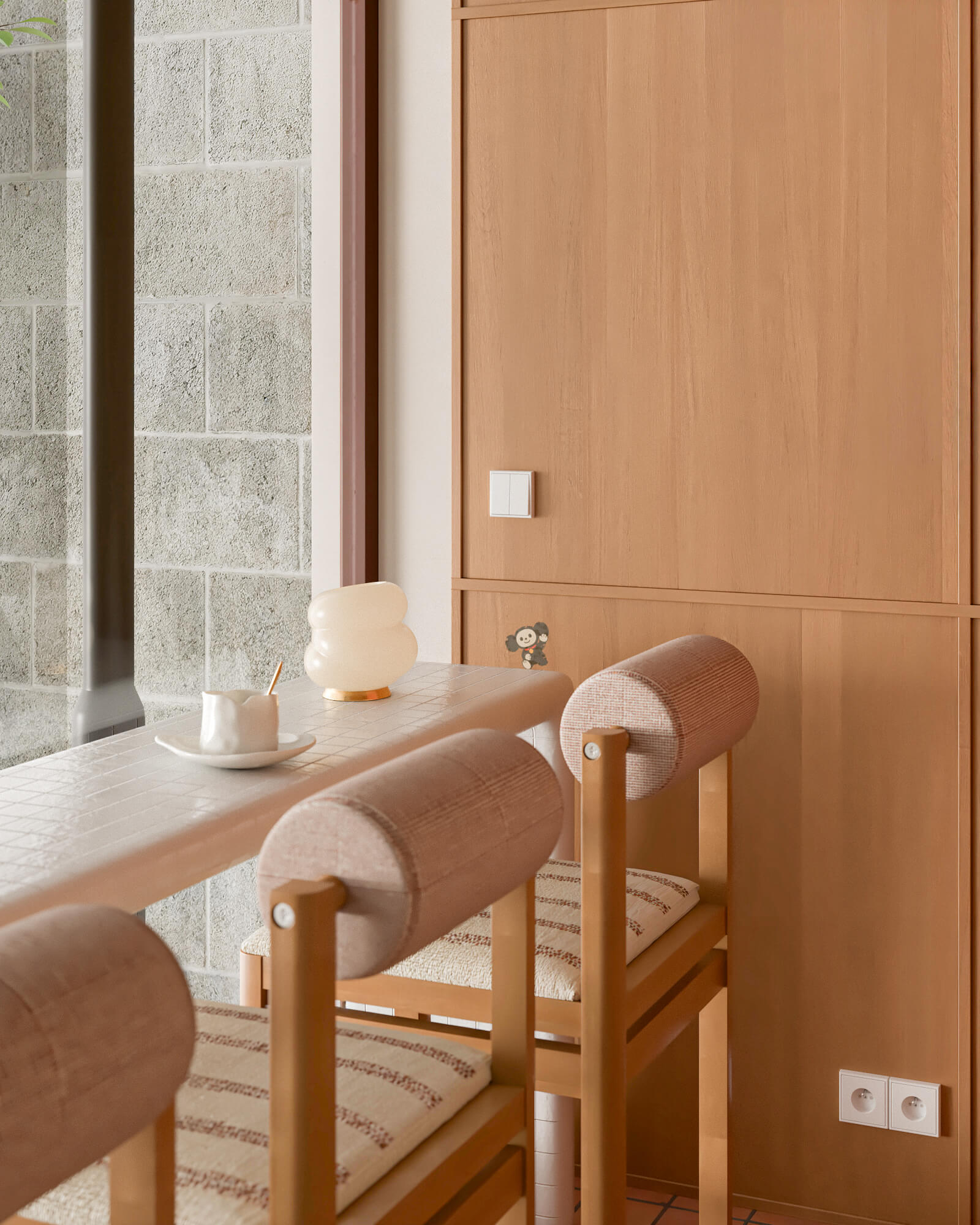 Le comptoir n’est pas qu’un mobilier, c’est un élément structurant, un volume précis mais ouvert. Les lignes sont claires, les formes arrondies, la palette feutrée : une cohérence silencieuse, presque invisible, mais perceptible dans chaque geste.