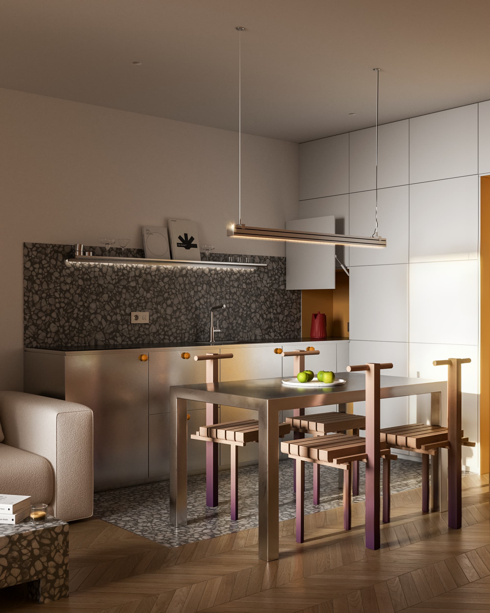 La cuisine en inox structure l’appartement, tandis que les chaises aux pieds violets créent une transition subtile du chaud au froid.