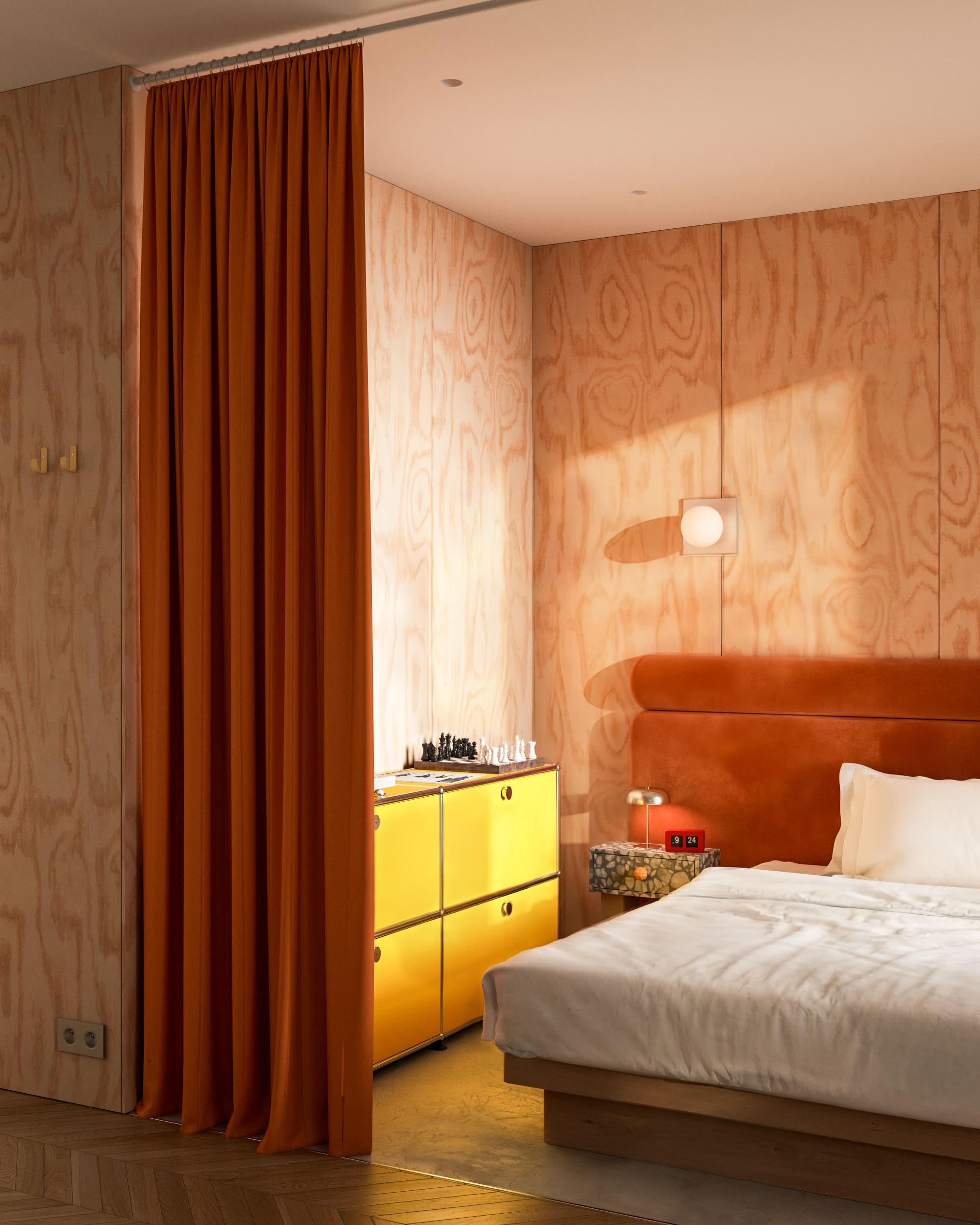 Dans la chambre, panneaux de bois et velours orangé forment un cocon. Le rideau remplace la cloison pour préserver la flexibilité du plan.
