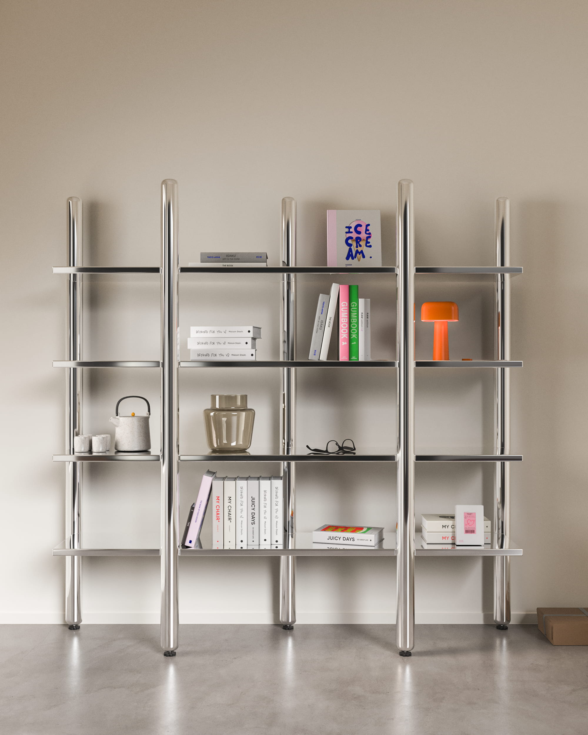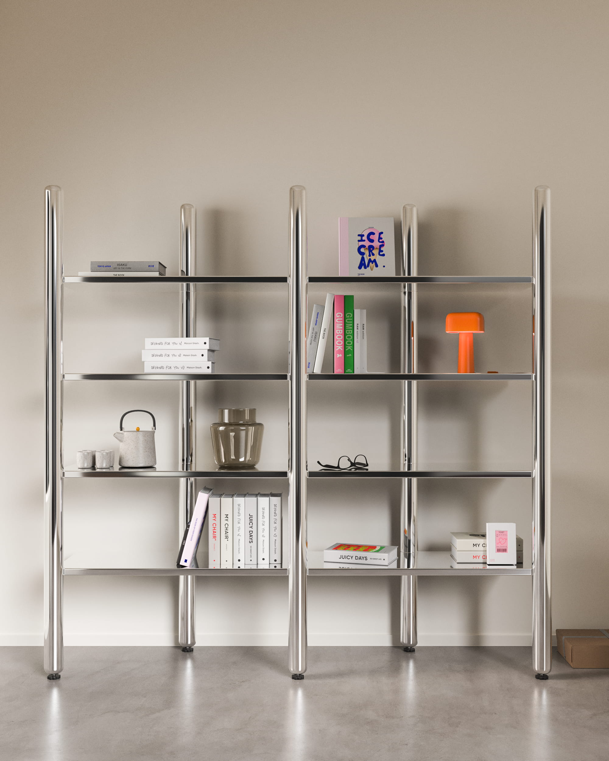 Le choix du chrome poli dépasse l’esthétique. En captant et en reflétant son environnement, la structure se fond dans l’espace. Elle devient presque immatérielle, laissant les objets prendre toute leur place visuelle. Le meuble agit comme un cadre silencieux.