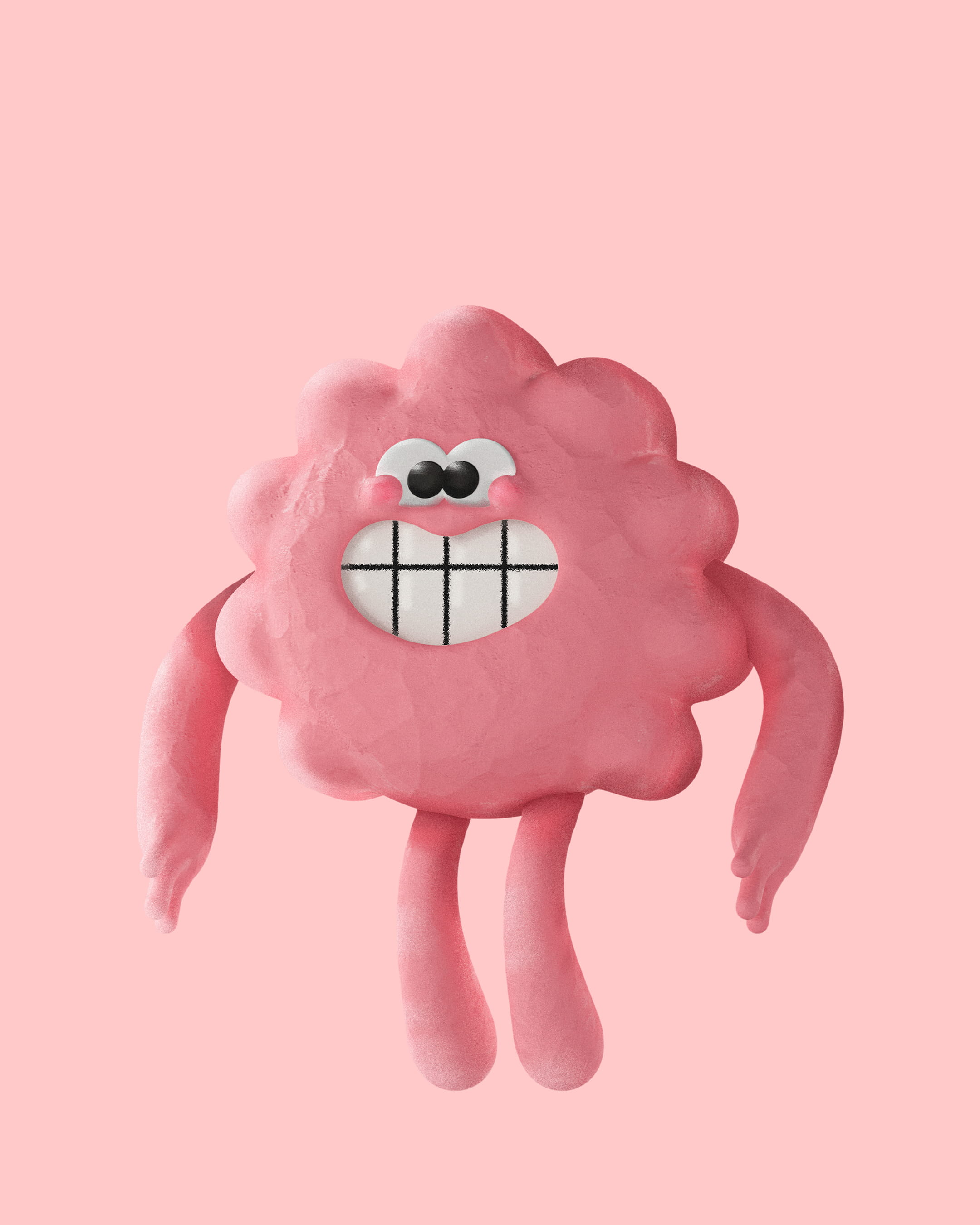 Le motif quadrillé structure l’ensemble et apporte une rigueur graphique qui contraste avec la rondeur ludique du personnage rose. Cette figure iconique incarne l’énergie et la vitalité du produit, tout en insufflant une dimension joyeuse.