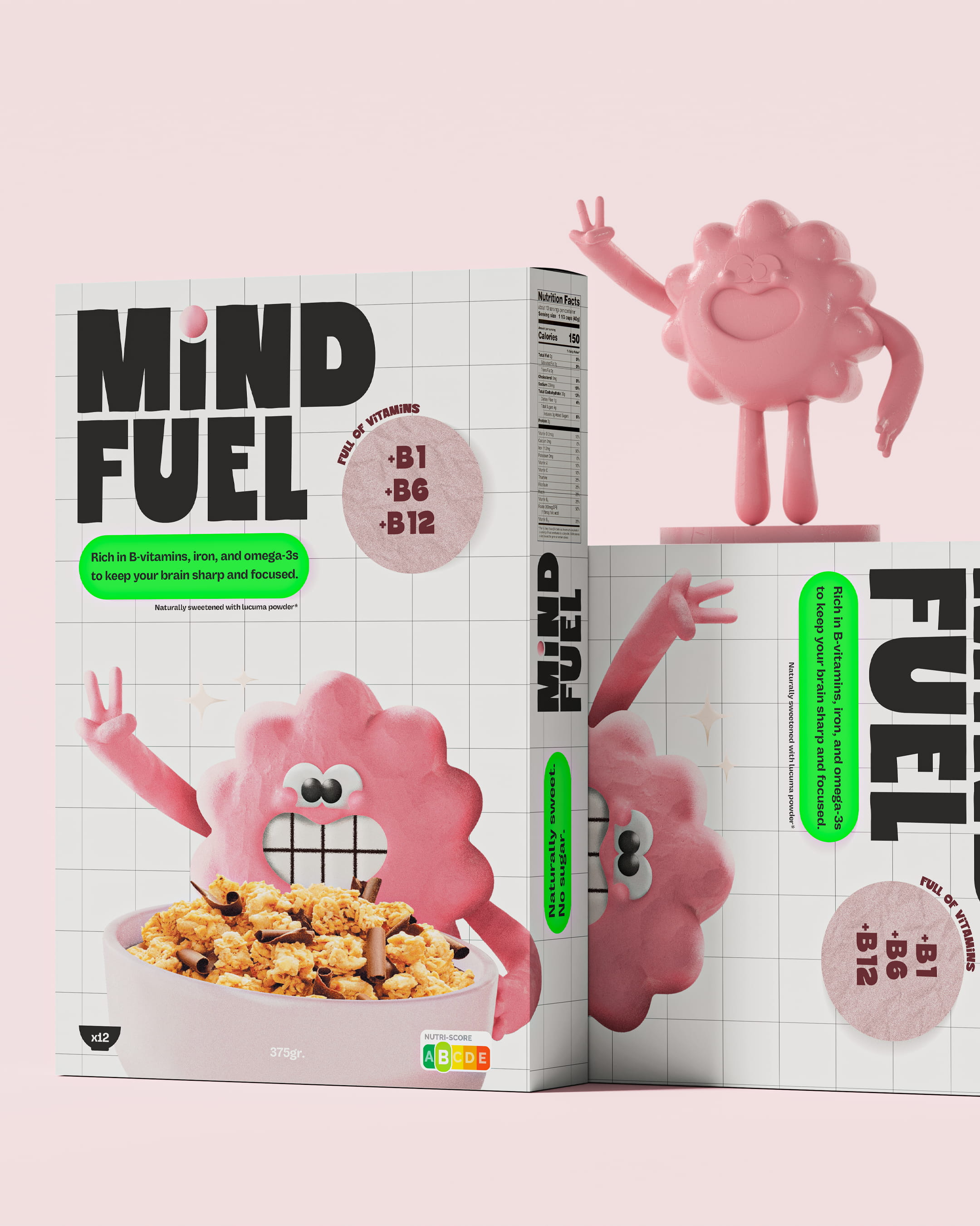Avec Mind Fuel, le packaging devient un véritable terrain d’expression graphique. Pensé comme un objet autant visuel que narratif, l’univers de cette boîte de céréales joue avec les codes du design contemporain, mêlant typographie affirmée et personnages expressifs.