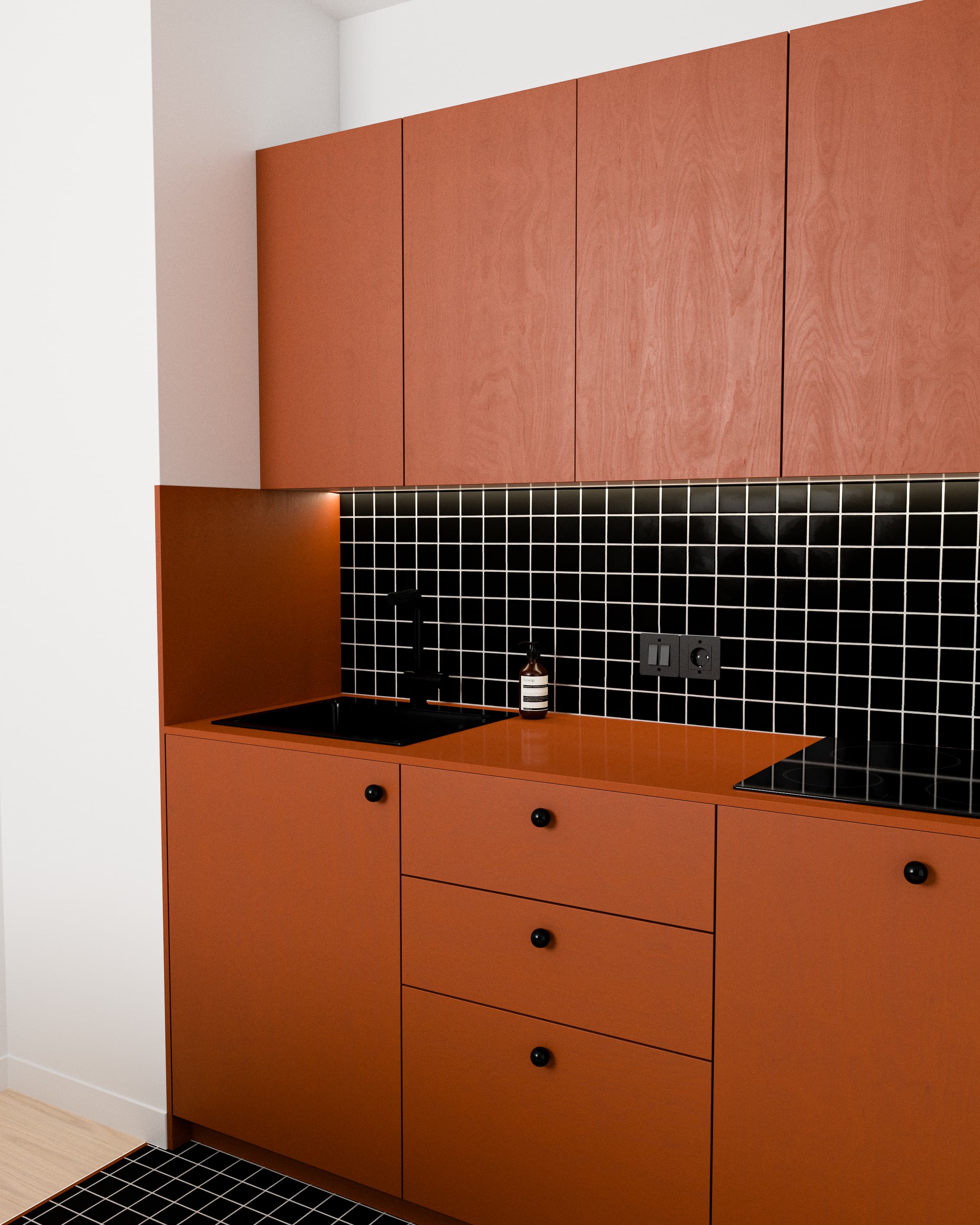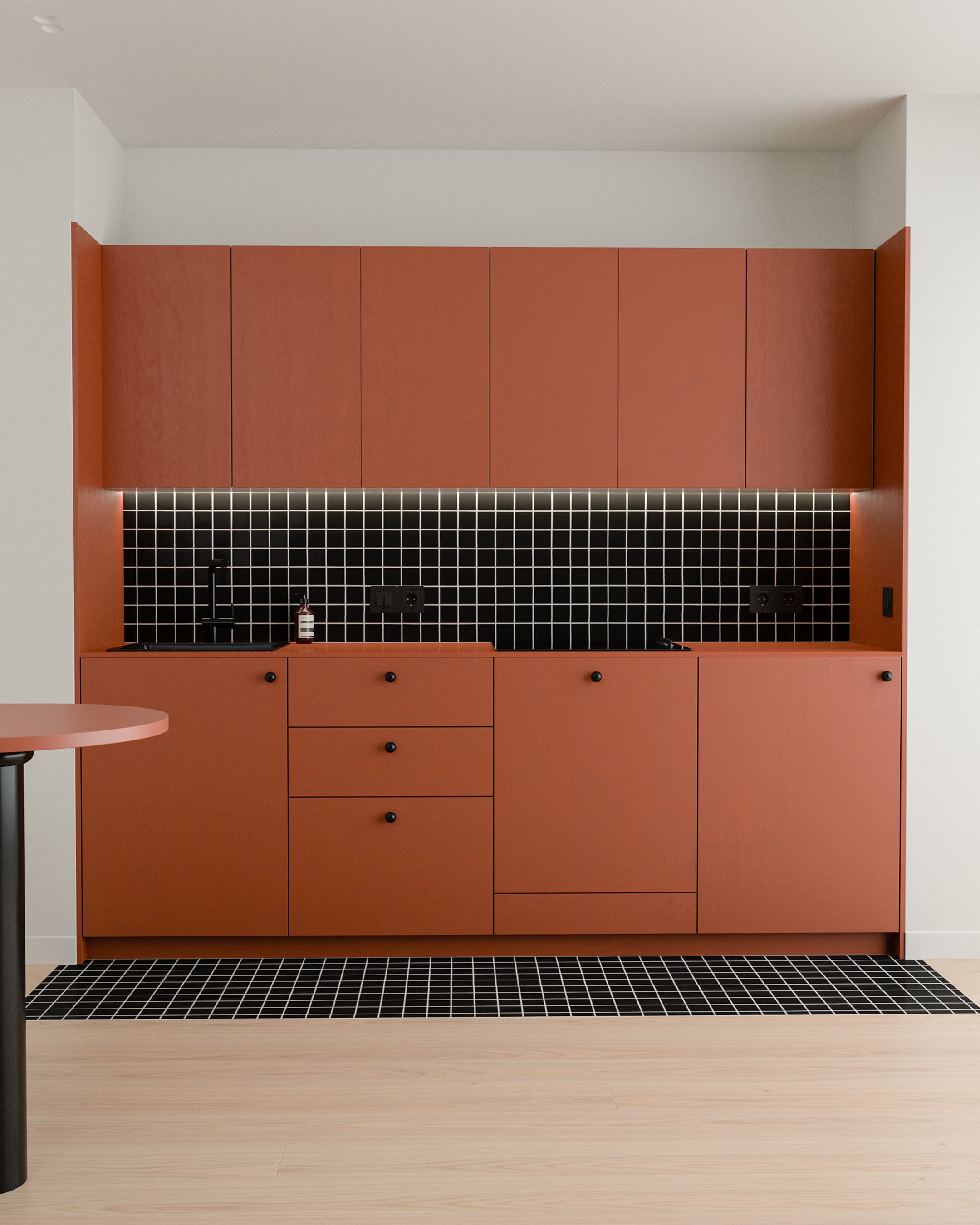 La robinetterie noire mate et les poignées boutons minimalistes ponctuent l'ensemble avec discrétion, laissant la vedette à cette teinte terreuse audacieuse. Une réalisation qui prouve que le minimalisme peut être tout sauf froid.