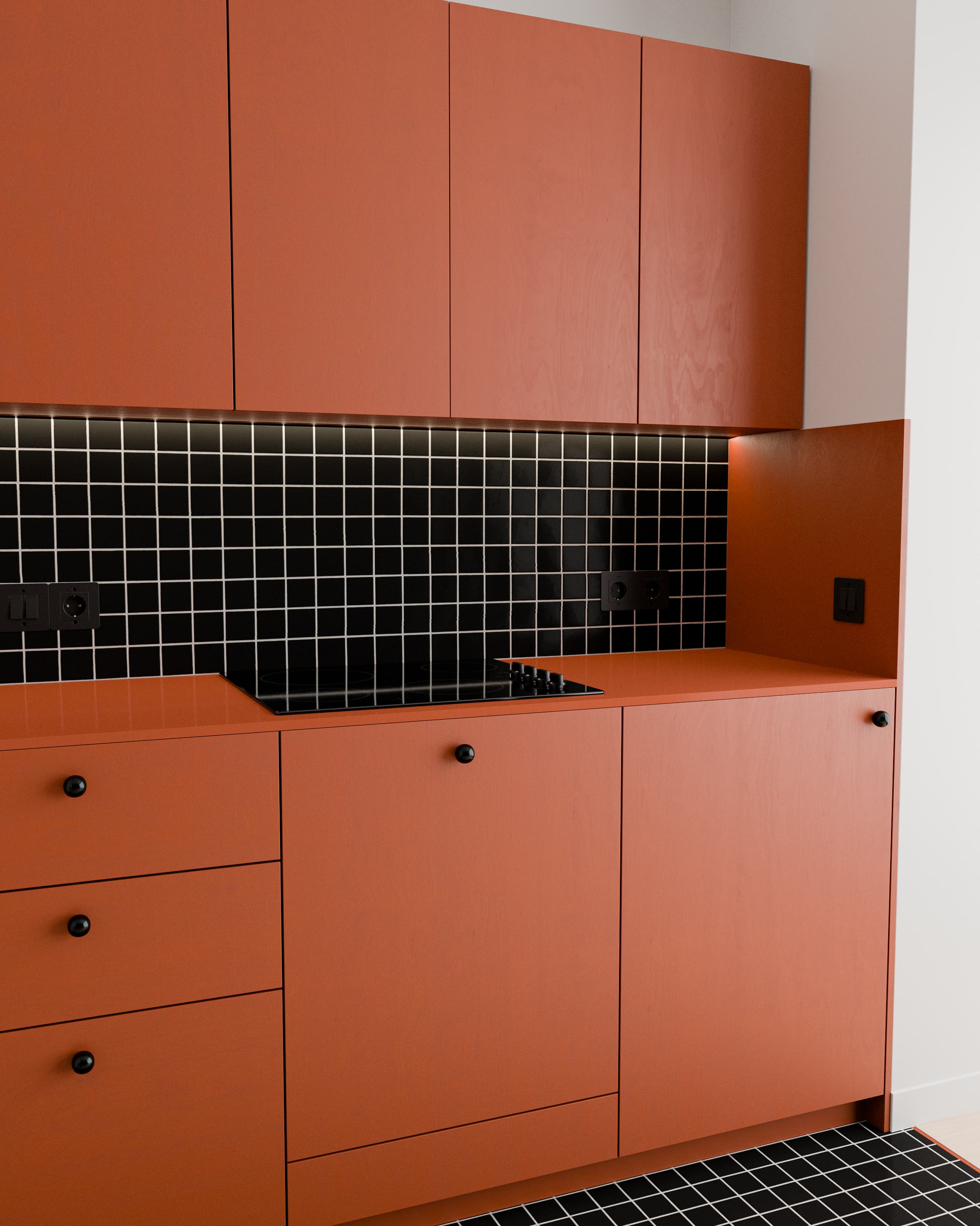L'ingéniosité du design réside dans ce dialogue graphique percutant entre les surfaces planes et le quadrillage hypnotique de la faïence noire. En prolongeant la crédence au sol tel un tapis de mosaïque, l'espace cuisine est visuellement délimité sans être cloisonné.